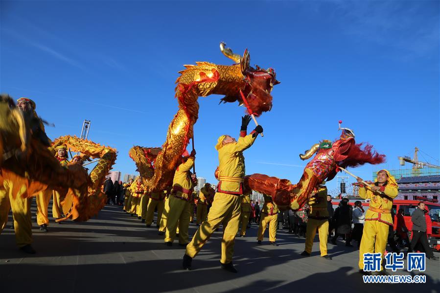 2月16日,山西省大同市举行非物质文化遗产展演,民间艺人在表演舞龙。