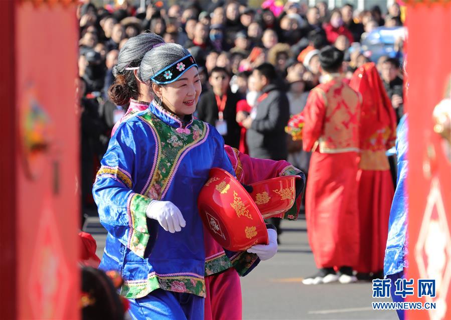 2月16日,民间艺人在山西大同古城景区表演大秧歌。