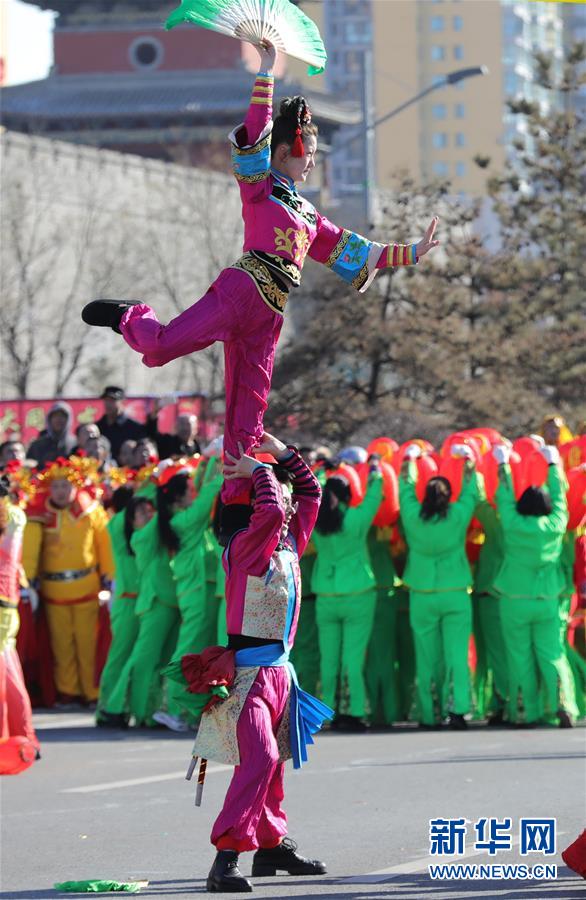 2月16日,民间艺人在山西大同古城景区表演大秧歌。