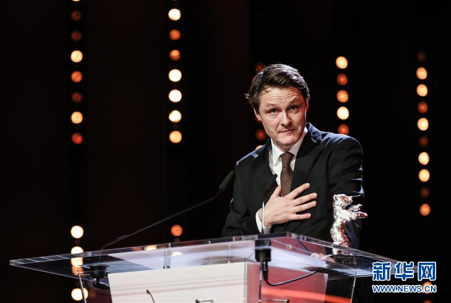 2月16日,在德国首都柏林,凭借影片《外出偷马》获颁杰出艺术贡献银熊奖(颁发给摄影、剪辑、音乐、服装或道具)的摄影师拉斯穆斯·维泽贝克发表获奖感言。 第69届柏林国际电影节主竞赛单元各奖项16日晚在柏林电影宫揭晓,影片《同义词》获得最佳影片金熊奖。 新华社记者单宇琦摄