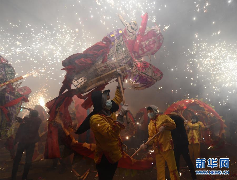 2月16日,人们在贵州省余庆县子营街道上里社区表演“舞龙嘘花”。 当日,余庆县上里社区举行舞龙民俗活动,来自周边村寨的10多条龙灯伴着震耳欲聋的鞭炮声和群众喷射的烟花上下飞舞,喜迎元宵佳节。 新华社发(贺春雨 摄)