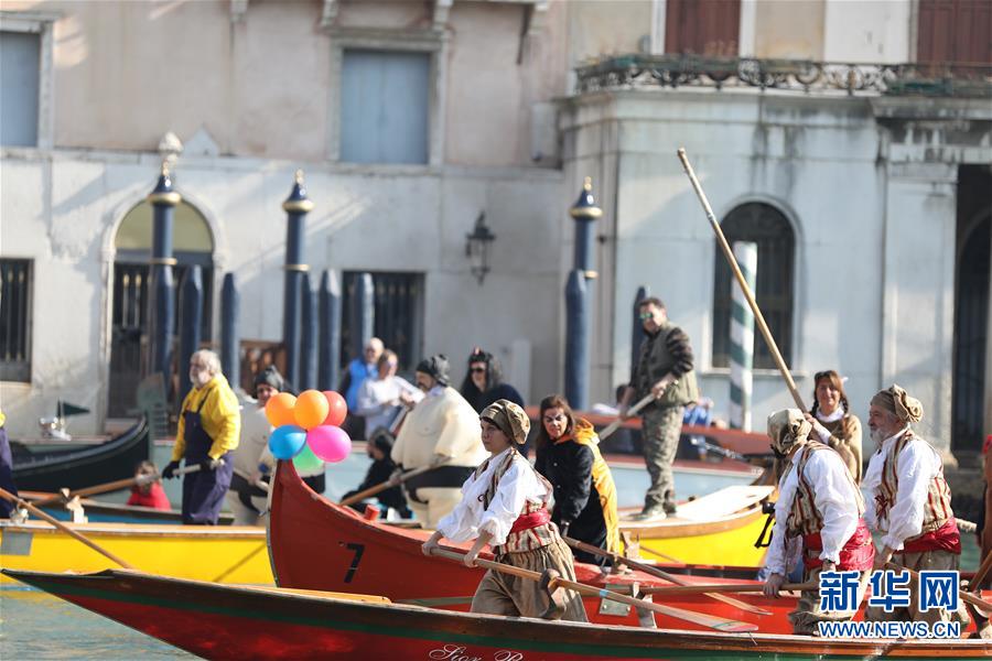 2月17日,在意大利威尼斯,人们参加水上巡游。 一年一度的威尼斯狂欢节16日晚在意大利水城威尼斯拉开帷幕。本届狂欢节将持续至3月5日。 新华社记者 程婷婷 摄