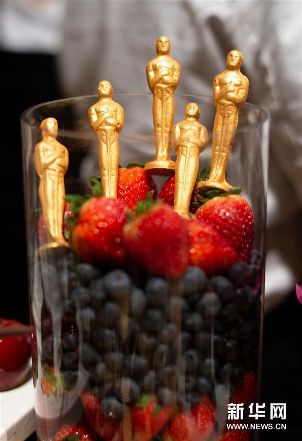 这是2月15日在美国加利福尼亚州好莱坞拍摄的晚宴预览活动现场的巧克力“小金人”。新华社/法新