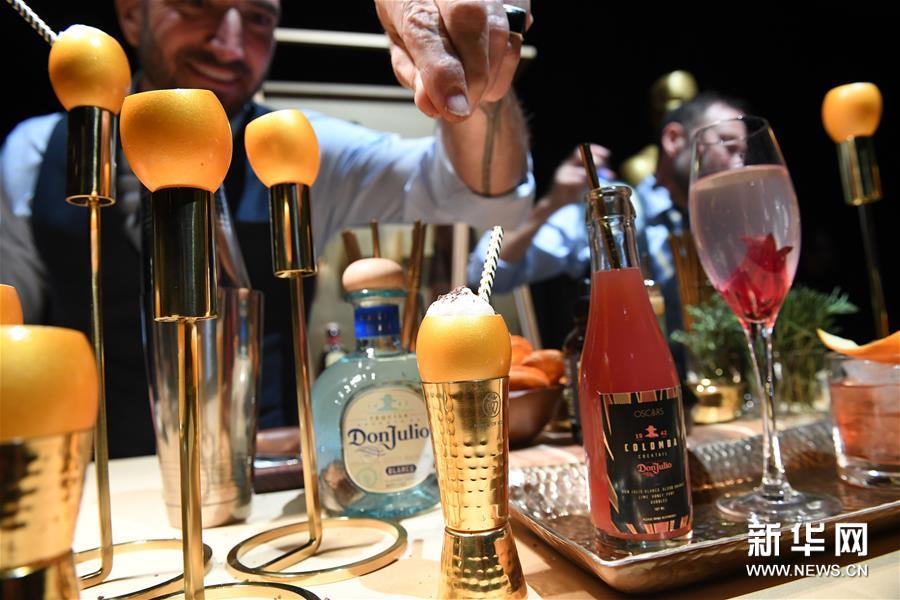 2月15日,在美国加利福尼亚州好莱坞,工作人员在晚宴预览活动上准备饮品。新华社/法新