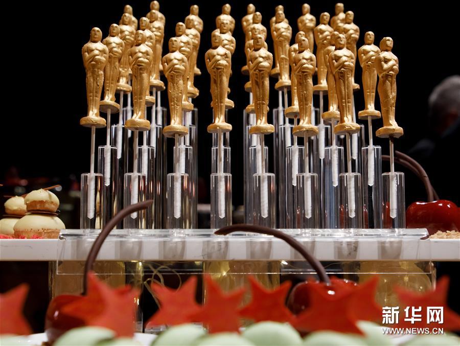 这是2月15日在美国加利福尼亚州好莱坞拍摄的晚宴预览活动现场的巧克力“小金人”。新华社/欧新