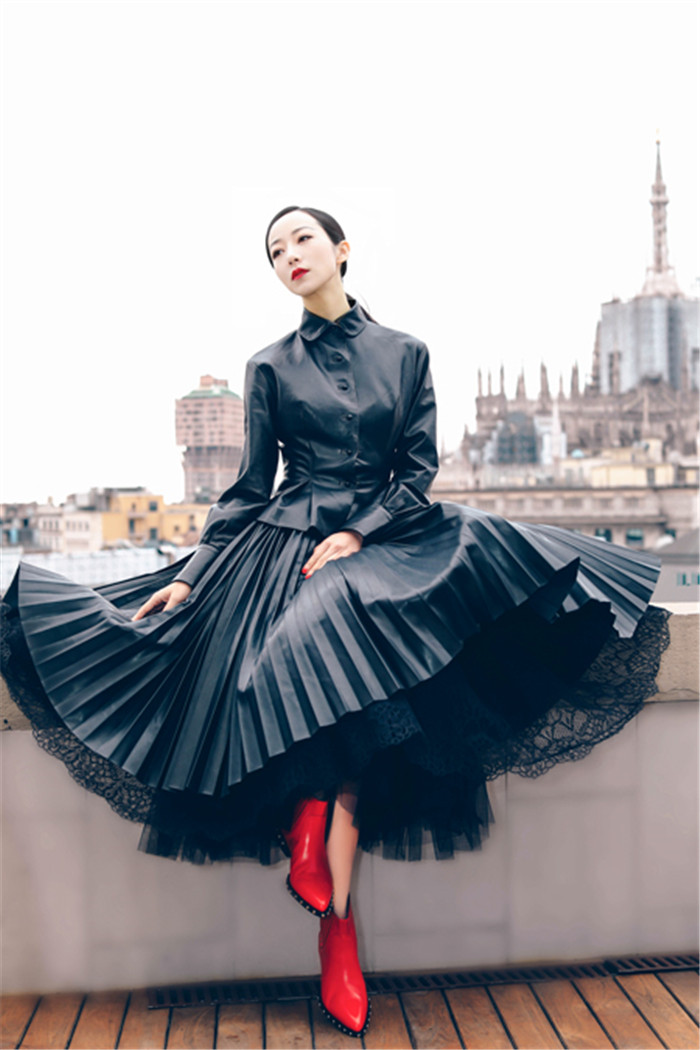 米兰时间2月24日,韩雪受邀出席意大利高端时装品牌2019秋冬系列大秀后,收到设计师特别邀请前往品牌参观,试穿最新秀款并与品牌CEO Tony Scervino先生及造型师进行交流。韩雪一套典雅黑色长裙搭配尖头红色长靴,收腰设计气场全开。露肩蕾丝裙搭配黑色皮衣,时尚感满分。