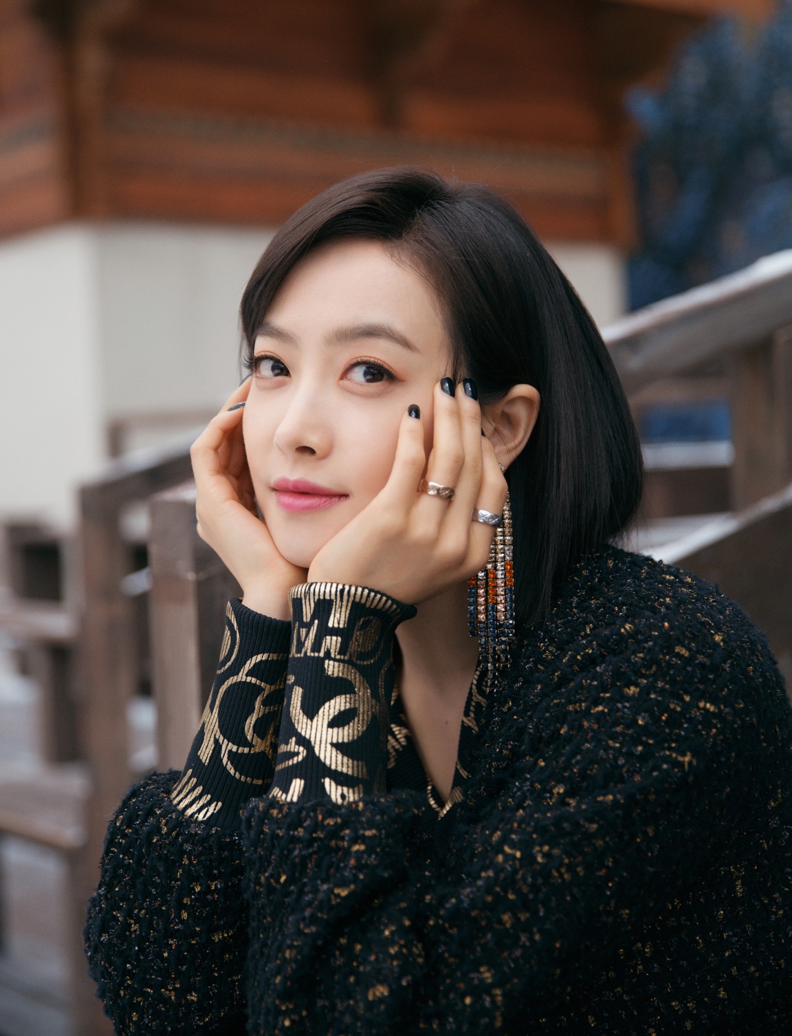 宋茜身着黑金斜纹软呢上衣和小羊皮长裤,搭配同系列流苏耳环,晚宴包和黑色鳄鱼皮短靴,华丽耀眼的黑金闪耀银装素裹的大皇宫,仿佛编织着一个精妙绝伦的梦境。宋茜时而对镜头甜笑,暖心动人,时而气场全开,展现飒爽迷人姿态。