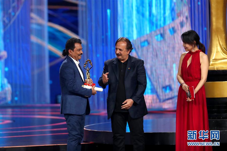 4月20日,闫妮(右)、马基德·马基迪(中)为获得“天坛奖最佳摄影奖”的影片《恐惧》颁奖。 当日,第九届北京国际电影节闭幕式暨颁奖典礼在北京怀柔国家中影数字制作基地举行。 新华社记者 孟永民 摄