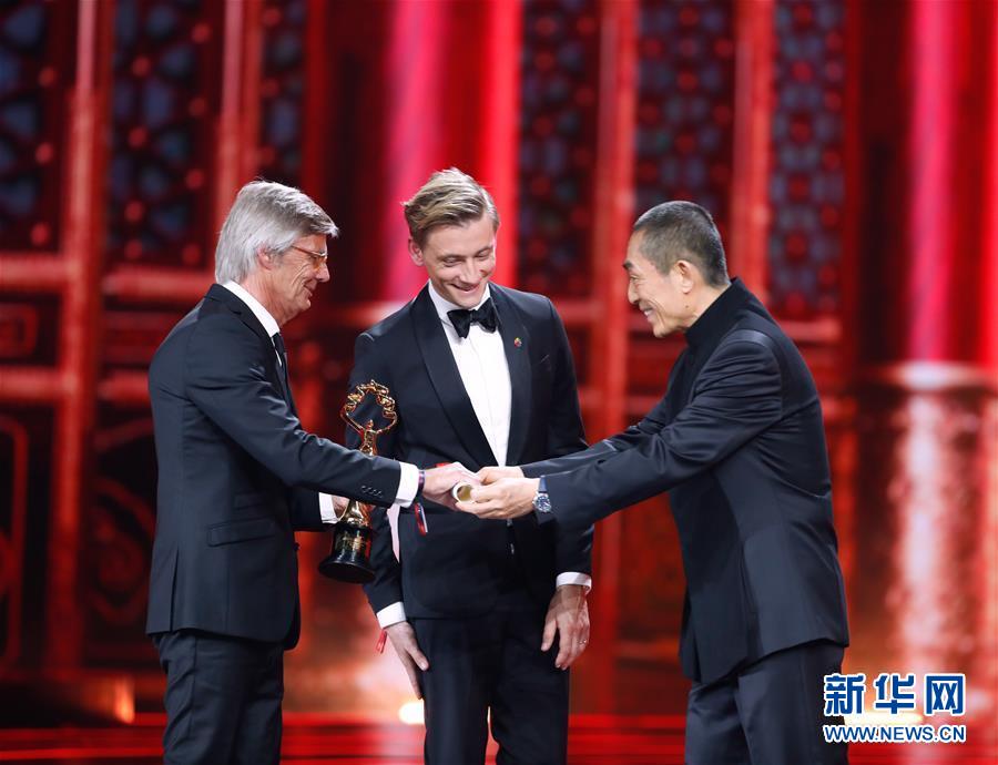 4月20日,影片《幸运儿彼尔》获得“天坛奖最佳影片奖”,张艺谋(右)为领奖者(左)颁奖。 当日,第九届北京国际电影节闭幕式暨颁奖典礼在北京怀柔国家中影数字制作基地举行。 新华社记者 沈伯韩 摄