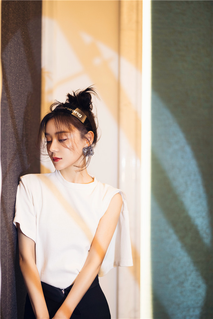 近日,袁姗姗曝光一组时尚大片,照片中的她身穿经典白色T恤,随性展现出简单优雅的少女感,丸子头造型慵懒迷人,不规则耳饰与复古红唇妆容相结合,颇有摩登女郎的风范,黑色的发箍搭配脸庞两侧的微卷的刘海,更添俏皮灵动的感觉。她或垂眸侧视,或低头沉思,或直视镜头,优雅大方不失自信明媚,举手投足间散发妩媚气息。