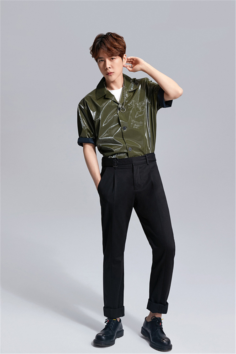 照片中徐海乔站在干净的纯色背景前,身穿墨绿色皮质短袖内搭白色打底,一条卷边黑色直筒裤加上黑色大头皮鞋。整体设计感满满,链条式项链和皮质的短袖给人一种金属感,同时上衣和裤子的卷边也相互呼应。尤其是皮鞋鞋头上的拼接还有鞋带的跳色让整套服装的搭配看起来更加细致。在照片中徐海乔眼神冷酷或侧头微笑帅气十足,坐在高脚凳上的他也充分展示了令人羡慕的大长腿。