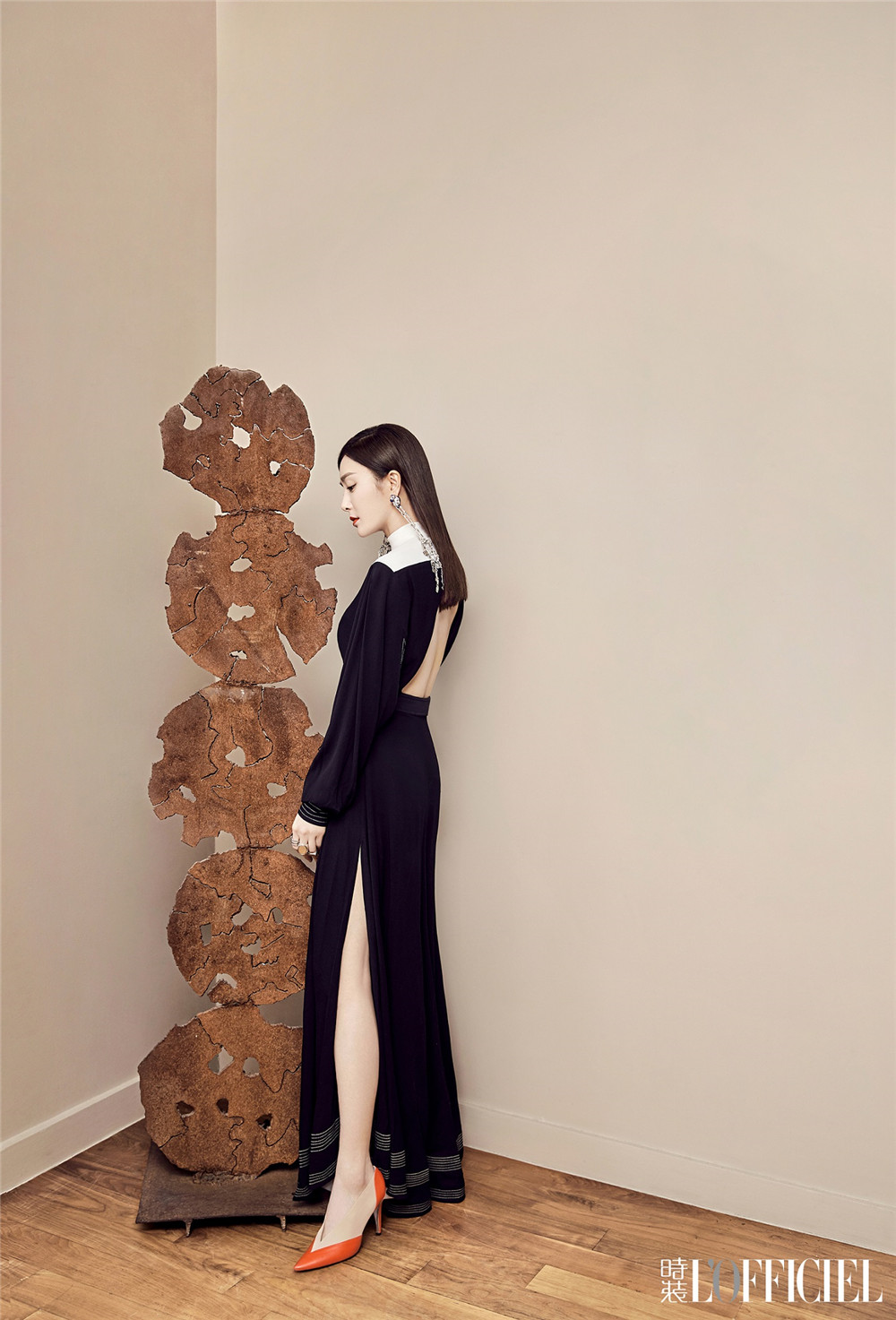 其中,秦岚或身着深蓝色波点缎面长袖长裙,长裙腰间上搭配金色环装饰,气质婉约优雅。或身穿黑色露背长裙,露出蝴蝶骨和笔直大长腿,展现无限魅力,女人味十足。或身着深蓝色荷叶边衬衫,把简约和优雅两种风格展现的淋漓尽致。面对镜头时,秦岚的眼神笃定而自信,气质优雅从容,令人动容。
