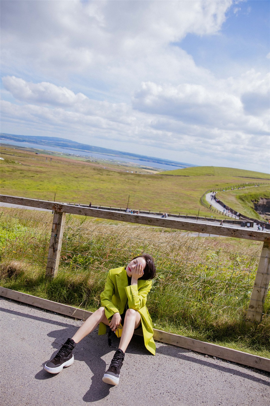 宋茜释出一组爱尔兰旅行照,身穿芥末绿西装搭配黑色短裤尽情玩耍。照片中,宋茜置身于蓝天白云下,明媚的背景与鲜明的色彩十分呼应,清爽出行,享受惬意时光。
