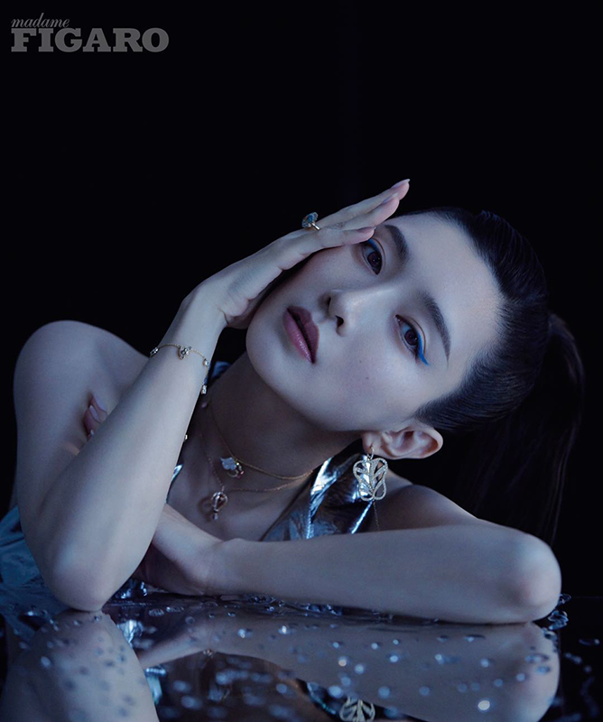 在这组主题为“水光何其潋滟”的写真中,江疏影或是身穿长款皮衣气场冷艳,或是化着蓝色眼线妆容,举手投足颇具优雅气场。
