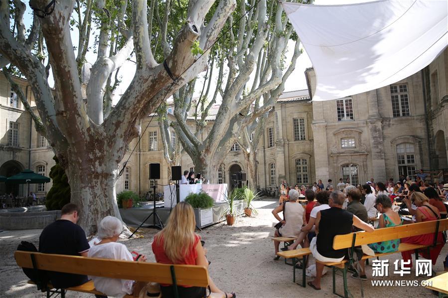 7月8日,在法国阿维尼翁举行的第73届阿维尼翁戏剧节上,导演孟京辉(后排左二)出席新闻发布会。新华社记者高静摄