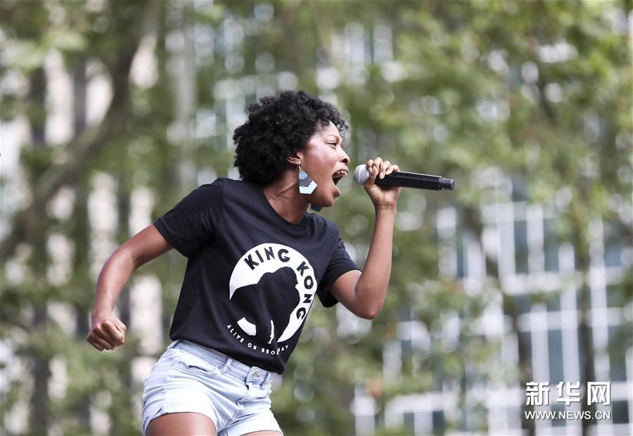 7月11日,在美国纽约,演员凯拉·戴维恩在“布赖恩特公园百老汇”活动中表演音乐剧《金刚》片段。新华社记者 王迎 摄当日,2019“布赖恩特公园百老汇”活动启动。