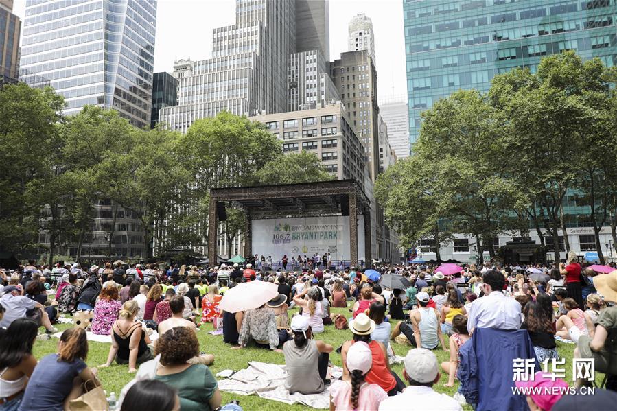7月11日,在美国纽约,观众观看“布赖恩特公园百老汇”活动的露天演出。新华社记者 王迎 摄