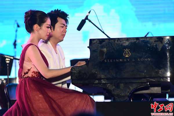 2019年7月13日,辽宁鞍山,郎朗携手妻子吉娜·爱丽丝(Gina Alice)现身音乐演奏会。两人上演四手联弹默契十足,甜蜜对视大撒狗粮,这神仙爱情真是令人羡慕。同时,郎朗的父母、汪明荃也到场助阵。(本组图片来源视觉中国,请勿转载。)