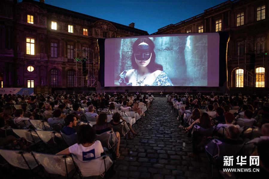 7月19日,在法国巴黎卢浮宫,人们观看电影《玛戈王后》。 当日,巴黎卢浮宫前举行了电影《玛戈王后》的露天放映活动。 新华社/法新