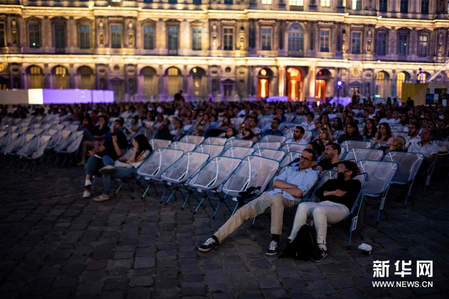 7月19日,在法国巴黎卢浮宫,人们观看电影《玛戈王后》。 当日,巴黎卢浮宫前举行了电影《玛戈王后》的露天放映活动。 新华社/法新