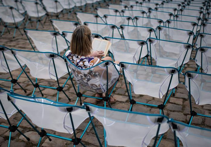 7月19日,在法国巴黎卢浮宫,一名女士在等待电影开场。 当日,巴黎卢浮宫前举行了电影《玛戈王后》的露天放映活动。