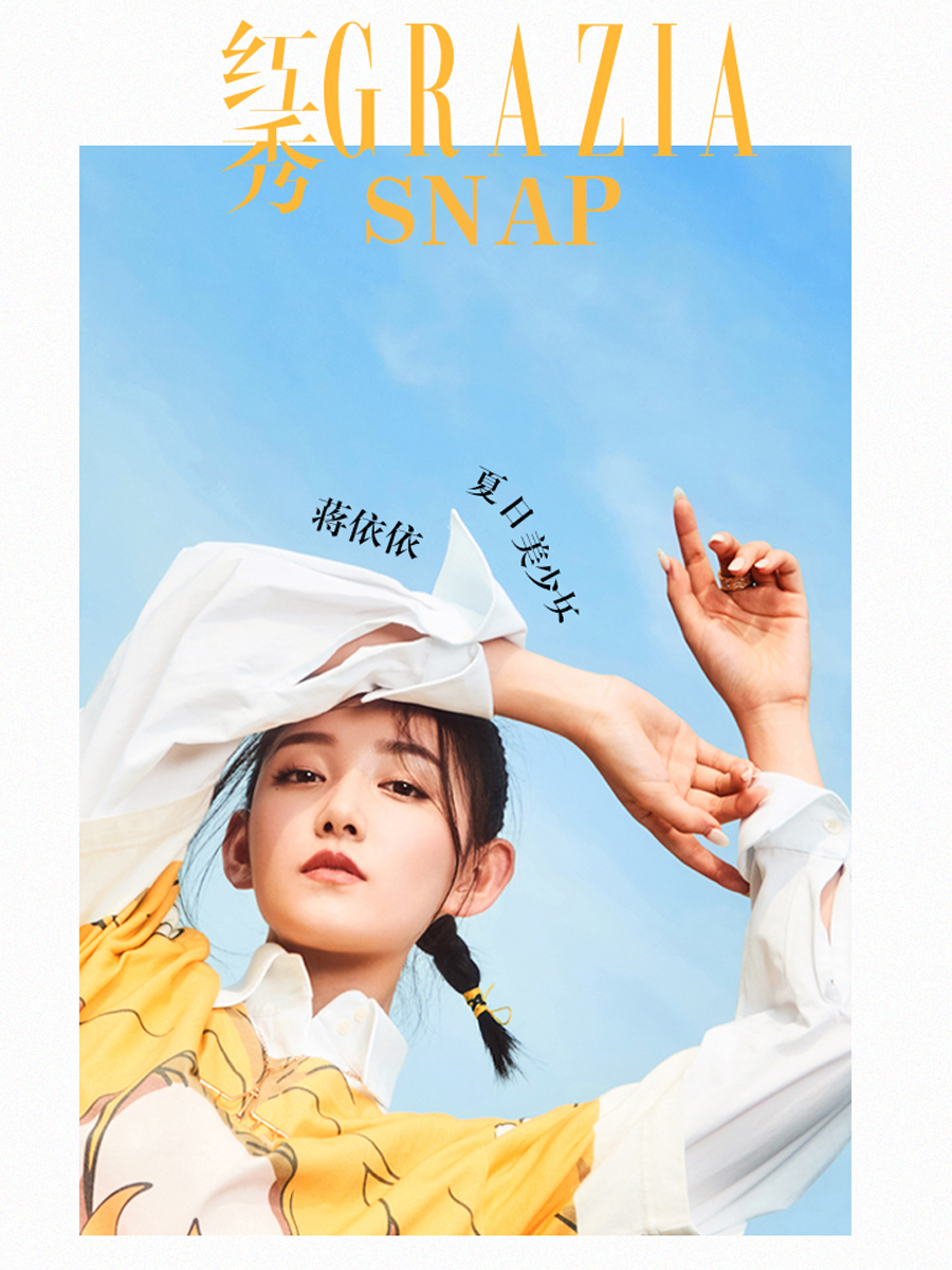 蒋依依为《红秀Grazia》拍摄的王牌街拍时尚大片曝光,身穿学院风西装的蒋依依置身树林草丛间,灵动的眼神,甜美的笑容,散发着文艺清新的气质。波点连衣裙搭配双马尾,率性可爱,以花遮面,略显迷离的眼眸,慵懒随性;站在天台上的蒋依依身穿“美少女”T恤尽显青春活力,元气满满,在蓝天白云下尽情挥洒肆意青春与自由。