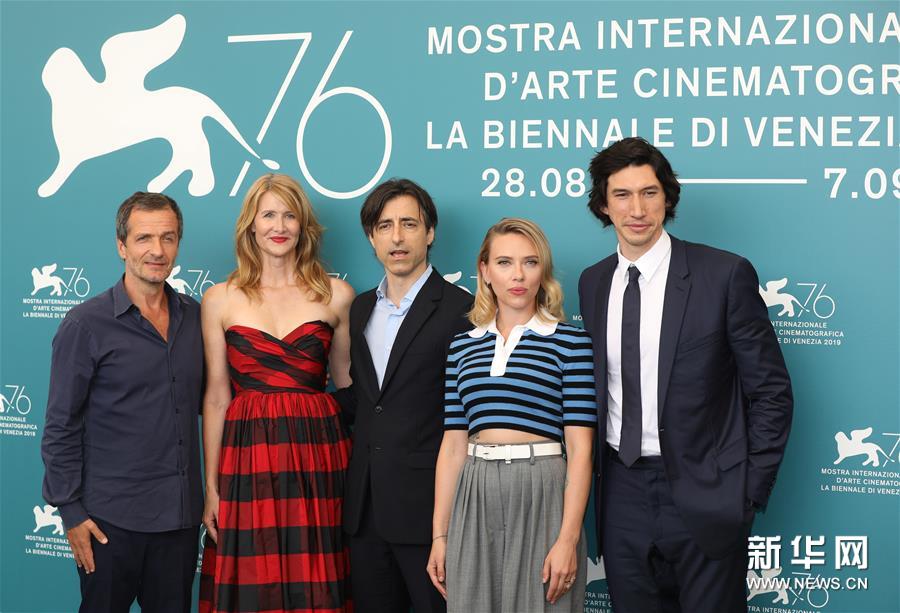 8月29日,在意大利威尼斯,电影《婚姻故事》的导演诺亚·鲍姆巴赫(中)携主创人员出席拍照式。新华社记者 程婷婷 摄