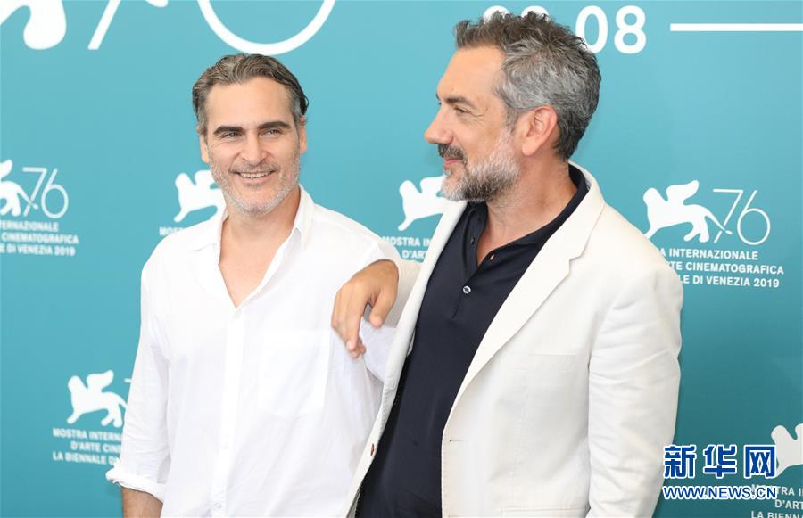 8月31日,在意大利威尼斯,导演托德·菲利普斯(右)与演员杰昆·菲尼克斯出席电影《小丑》拍照式。 电影《小丑》入围第76届威尼斯电影节主竞赛单元。 新华社记者 程婷婷 摄