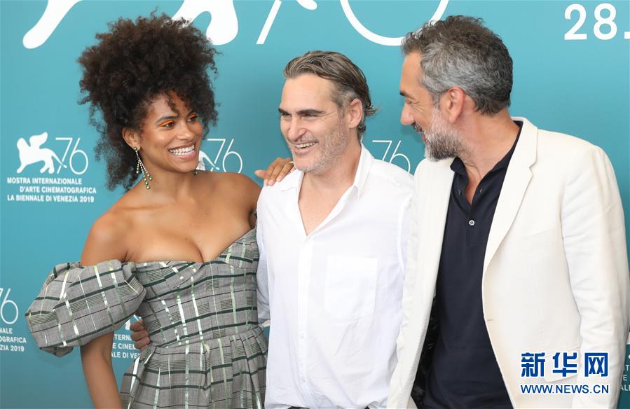 8月31日,在意大利威尼斯,(从左至右)演员扎齐·比茨、演员杰昆·菲尼克斯和导演托德·菲利普斯出席电影《小丑》拍照式。 电影《小丑》入围第76届威尼斯电影节主竞赛单元。 新华社记者 程婷婷 摄