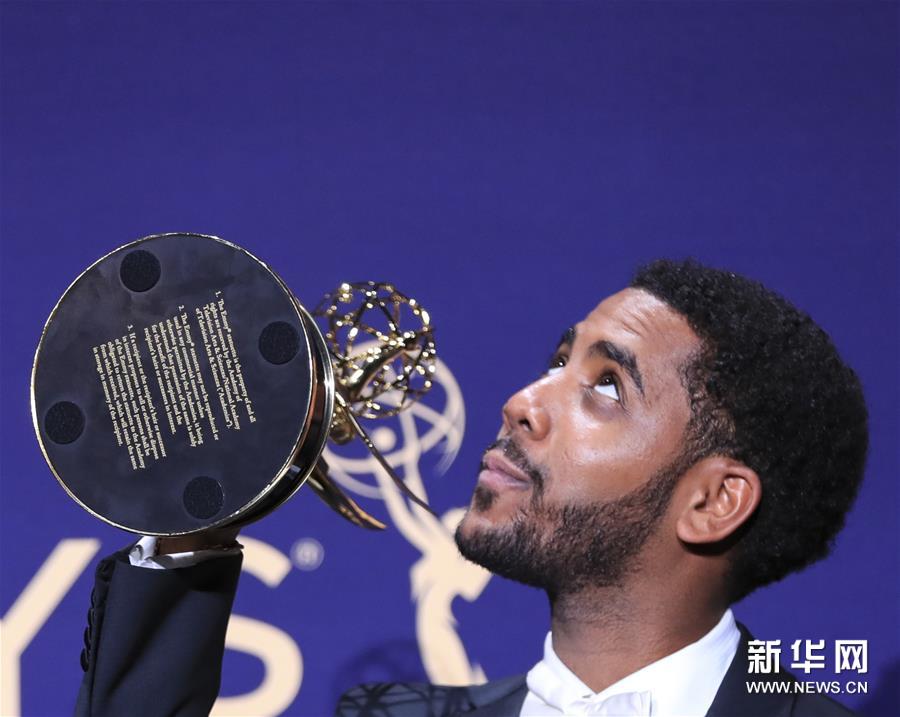 9月22日,在美国洛杉矶,《有色眼镜》的演员贾雷尔·杰罗姆展示奖杯。他获得艾美奖限定剧最佳男主角奖。新华社记者李颖摄
