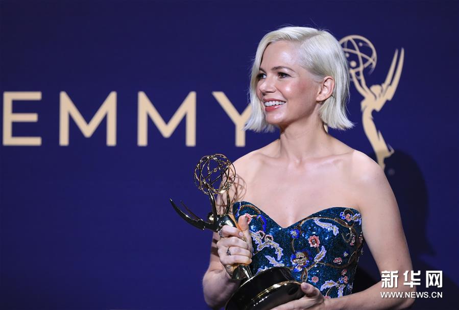 9月22日,在美国洛杉矶,《佛西与沃登》的演员米歇尔·威廉姆斯展示奖杯。她获得艾美奖限定剧最佳女主角奖。新华社记者李颖摄