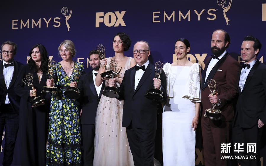 9月22日,在美国洛杉矶,《伦敦生活》主创展示奖杯。亚马逊的剧集《伦敦生活》获得艾美奖喜剧类最佳剧集奖。新华社记者李颖摄