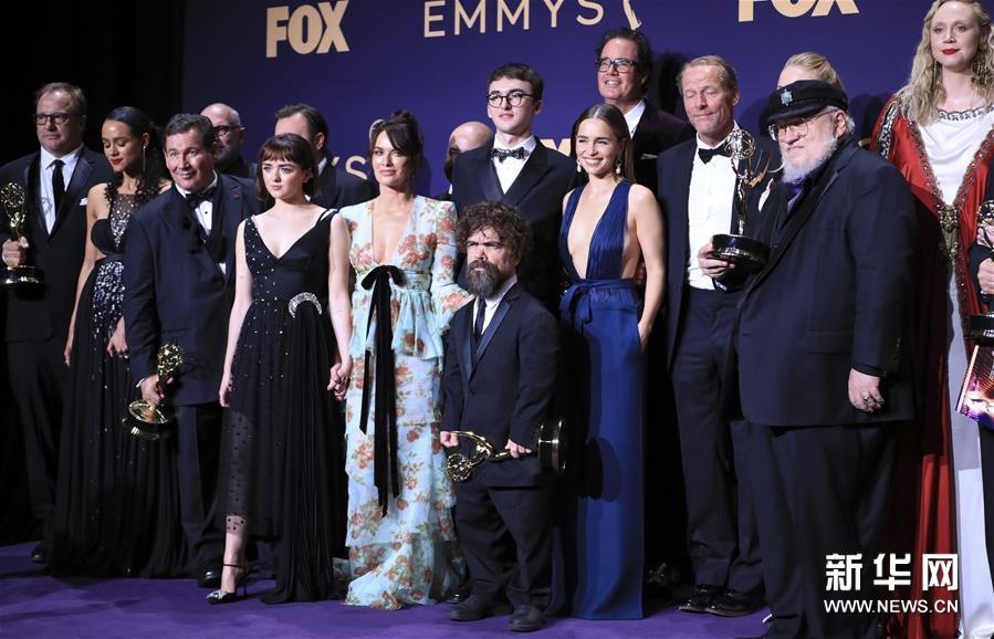 9月22日,在美国洛杉矶,《权力的游戏》主创人员在颁奖典礼上合影。新华社记者李颖摄