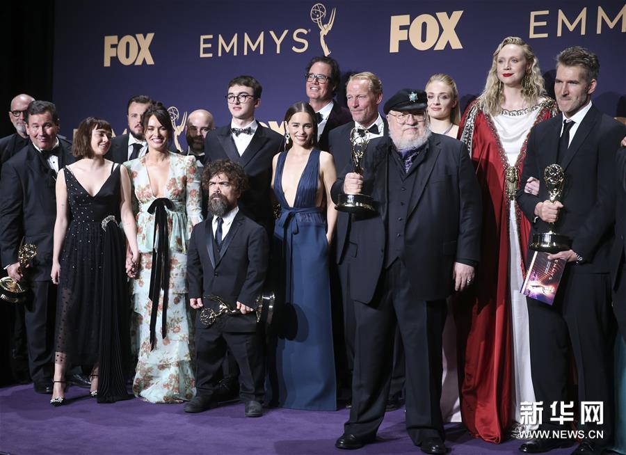 9月22日,在美国洛杉矶,《权力的游戏》主创人员在颁奖典礼上合影。新华社记者李颖摄