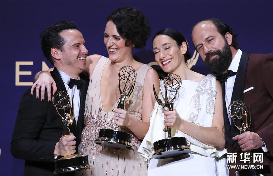 9月22日,在美国洛杉矶,《伦敦生活》主演展示奖杯。亚马逊的剧集《伦敦生活》获得艾美奖喜剧类最佳剧集奖。新华社记者李颖摄