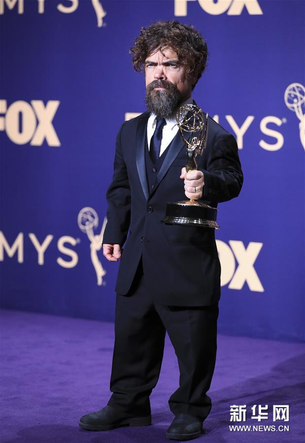9月22日,在美国洛杉矶,《权力的游戏》演员彼特·丁拉基展示奖杯。他获得艾美奖剧情类最佳男配角奖。新华社记者李颖摄
