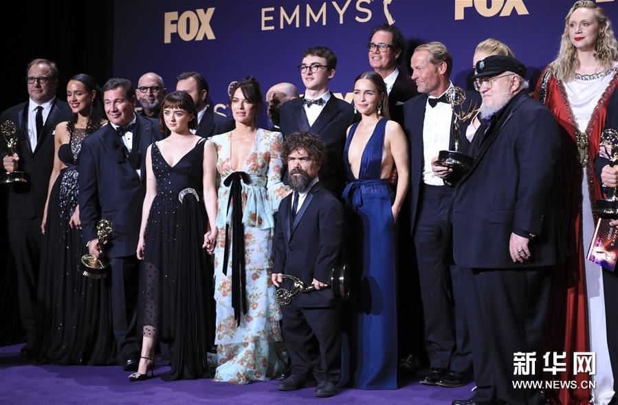 9月22日,在美国洛杉矶,《权力的游戏》主创人员在颁奖典礼上合影。新华社记者李颖摄