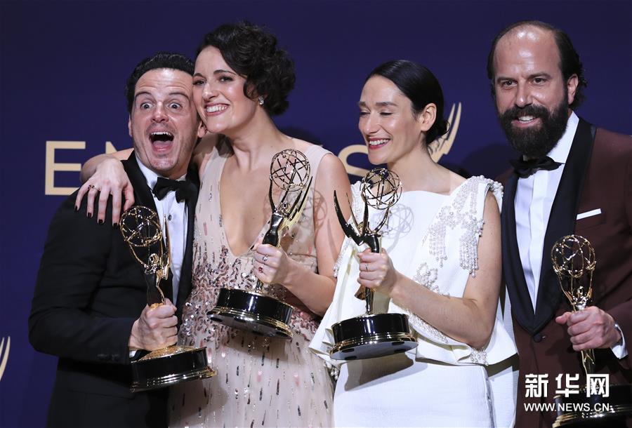 9月22日,在美国洛杉矶,《伦敦生活》主演展示奖杯。亚马逊的剧集《伦敦生活》获得艾美奖喜剧类最佳剧集奖。新华社记者李颖摄