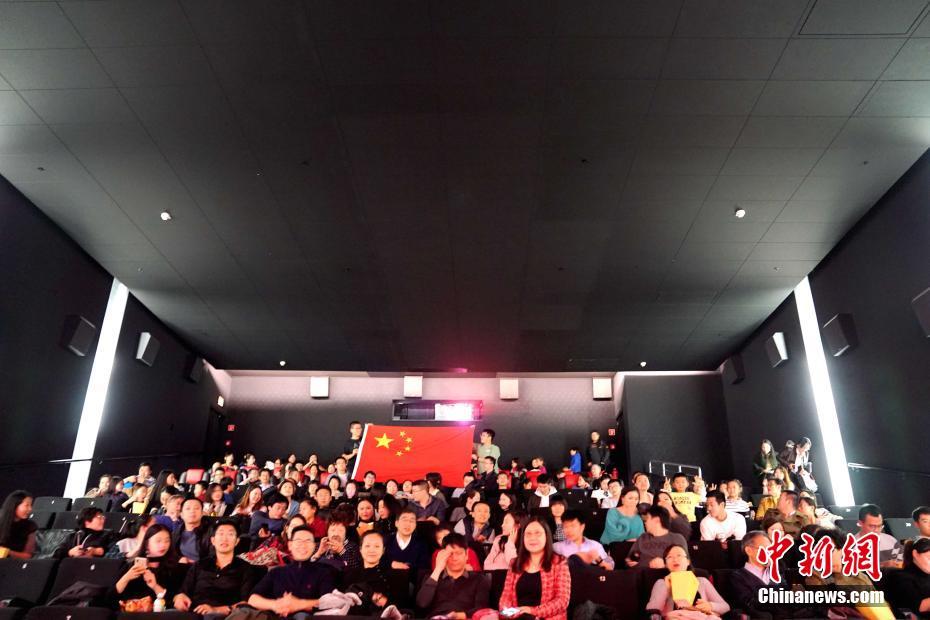 10月3日晚,德国柏林CinemaxX影院一场加映包场《我和我的祖国》开映前,观影的留学生和本地华人与中国国旗合影。