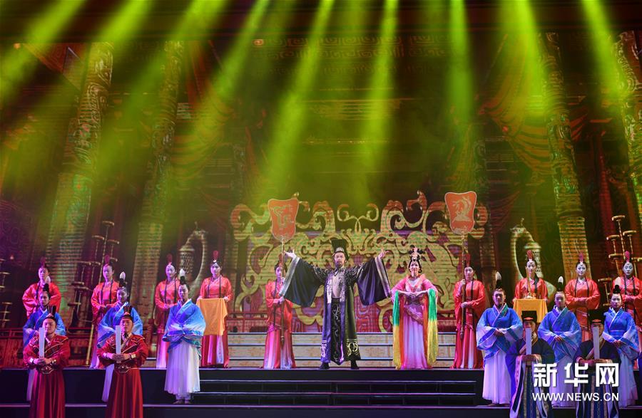 10月19日,演员在表演汉韵情景剧《汉风飞扬》第二幕“天地祥和”。新华社记者陶明摄10月19日,演员在表演汉韵情景剧《汉风飞扬》第四幕“文华盛世”。