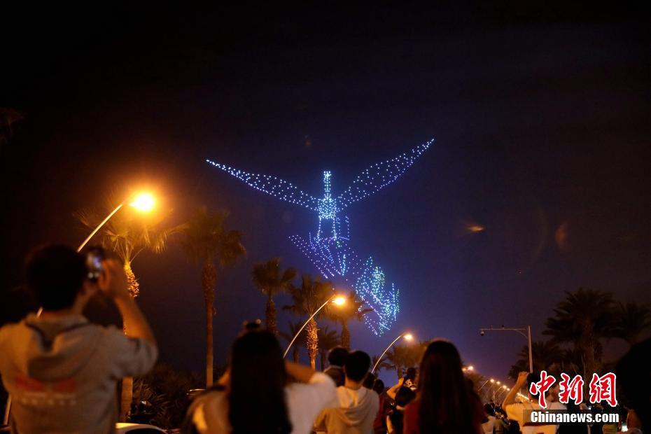 11月17日晚,在厦门会展中心沙滩,1200架无人机腾空而起以黑夜为背景,伴随音乐节奏变换出各种造型,迎接即将到来的第28届金鸡百花电影节。图为无人机变幻成厦门“市鸟”白鹭造型。中新社记者 李思源 摄
