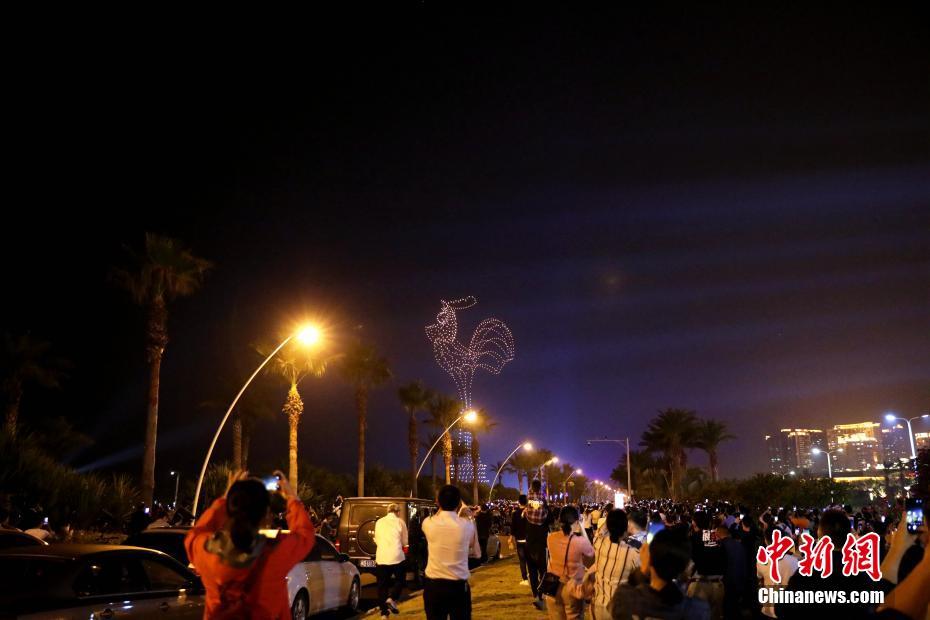 11月17日晚,在厦门会展中心沙滩,1200架无人机腾空而起以黑夜为背景,伴随音乐节奏变换出各种造型,迎接即将到来的第28届金鸡百花电影节。图为大量市民前往围观。中新社记者 李思源 摄