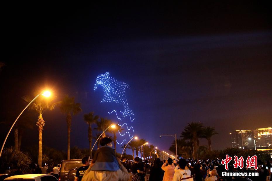 11月17日晚,在厦门会展中心沙滩,1200架无人机腾空而起以黑夜为背景,伴随音乐节奏变换出各种造型,迎接即将到来的第28届金鸡百花电影节。图为无人机组成中华白海豚造型。