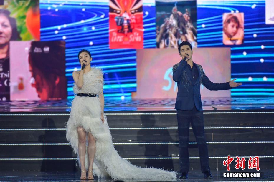 12月8日晚,第二届海南岛国际电影节在海南三亚落幕。首次增设的“金椰奖”奖项在当晚的闭幕式揭晓,《气球》、《大火将至》等中外影片榜上有名。图为江疏影(左)、许魏洲演唱歌曲。 中新社记者 骆云飞 摄