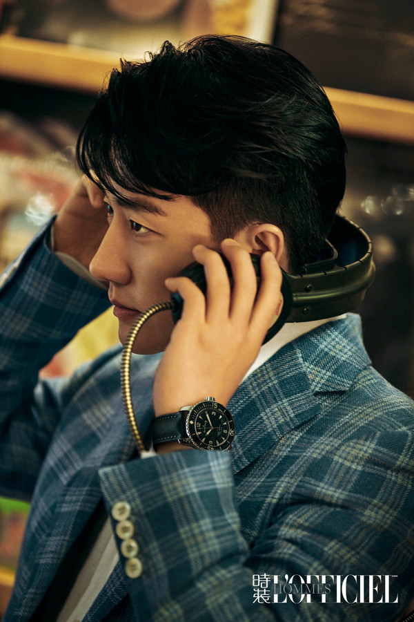 在曝光的内页中,黄轩置身于复古唱片店,在暖黄色灯光的照耀下,安静且从容。时而身穿蓝白相间格子外套,温暖文艺;时而身穿深蓝色西服套装,绅士有型;亦或又身穿黑色外套内搭橘色T恤,休闲随性。或驻足倾听,或仔细寻觅,侧颜照更是帅气十足。