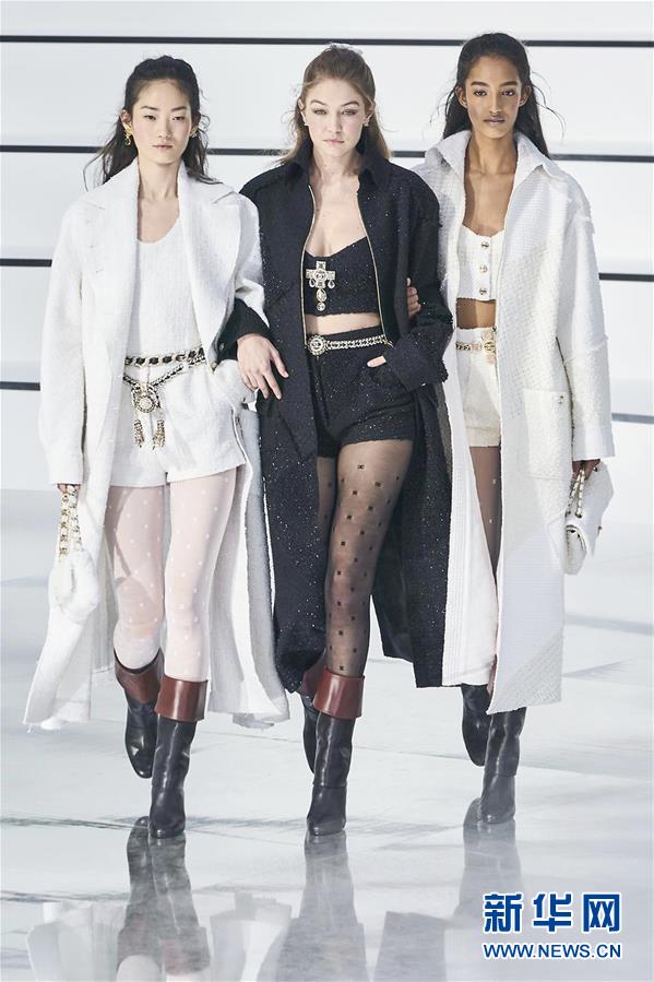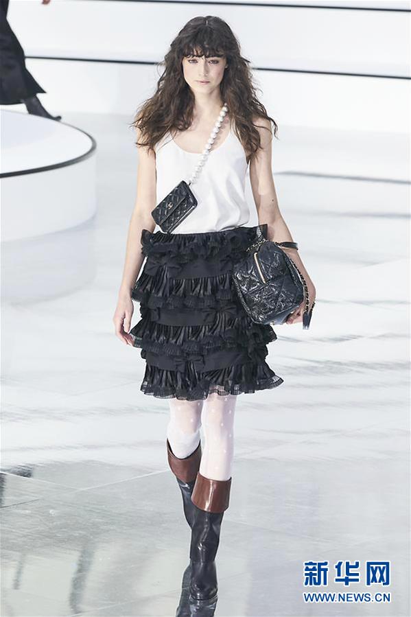 3月3日,在法国巴黎时装周上,模特展示香奈儿品牌2020/21秋冬高级成衣。 本次香奈儿新品成衣以品牌标志性的黑色白色为主,穿插几许淡绿,与标志性的粉红色系,带来一丝独特的柔和与鲜明的轮廓。 新华社发(皮耶罗·比亚西翁 摄)
