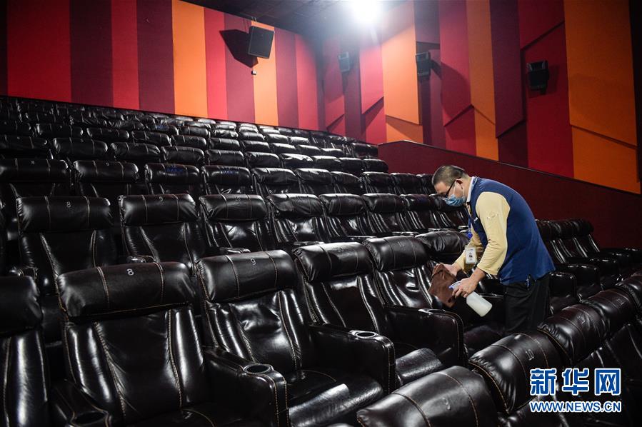 7月21日,万达影城北京CBD万达广场店工作人员在放映厅内进行消杀清洁工作。 当日,记者在北京市新型冠状病毒肺炎疫情防控工作新闻发布会上获悉,北京市低风险地区电影院在各项防控措施有效落实到位的前提下,可于7月24日有序恢复开放营业。记者探访两家电影院,工作人员正在做复工前的消杀清洁工作。 新华社记者 彭子洋 摄