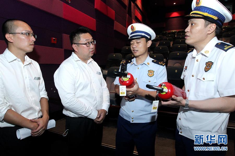 7月23日,消防员对上海天山电影院观影厅的消防器材进行抽查。 当日,上海市长宁区消防救援支队对辖区内的电影节展映影院进行消防设施再检查,并指导电影院员工提升消防措施,确保即将揭幕的第23届上海国际电影节安全举行。 新华社记者 陈飞 摄