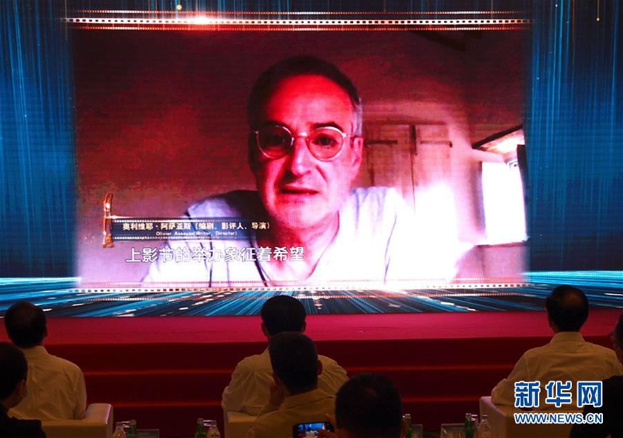 法国导演奥利维耶·阿萨亚斯通过视频连线方式点赞上海国际电影节主办方的一系列创新举措(7月25日摄)。新华社记者 任珑 摄