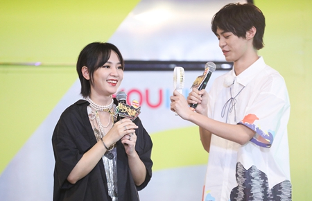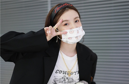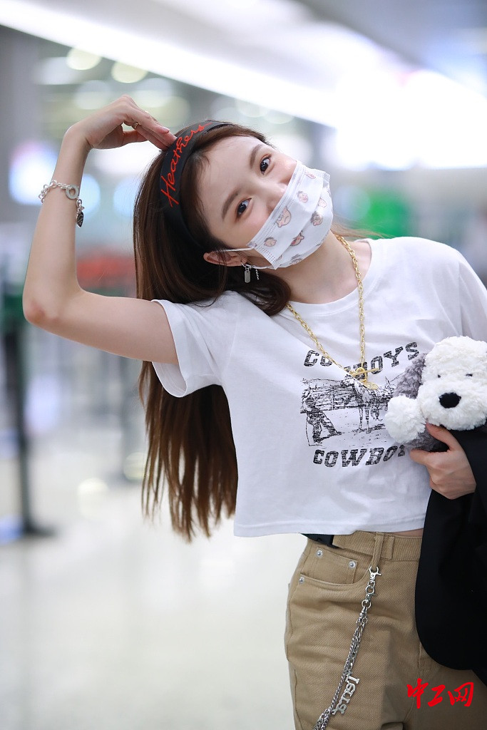 2020年08月12日,上海,林小宅现身机场,她口罩遮面比“V”卖萌,头戴发箍长发披肩,身穿白T恤搭配休闲长裤,挥手致谢送机粉丝。签约供稿人/视觉中国
